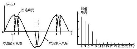(a) 電網輸入端電流和電壓的畸變 (b)峰值電流中的各次諧波分量頻譜
