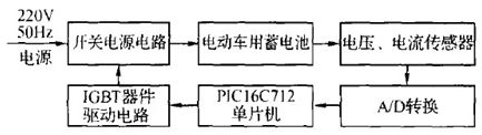 目前,電動(dòng)車(chē)電池作為一種儲(chǔ)能裝置,主要以鉛酸蓄電池為主,充電器是專(zhuān)門(mén)針對(duì)鉛酸蓄電池所設(shè)計(jì)的。傳統(tǒng)的蓄電池充電器采用電流/電壓負(fù)反饋的方法來(lái)達(dá)到恒流/恒壓充電的目的,為了實(shí)現(xiàn)充電過(guò)程各種工作參量的實(shí)時(shí)監(jiān)測(cè)及智能多段式充電策略的精確控制,引入電流/電壓反饋環(huán),應(yīng)用P IC16C712 單片機(jī)及相應(yīng)的控制電路,其硬件結(jié)構(gòu)框圖如圖1所示,電路圖如圖2所示。