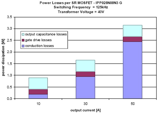 要優(yōu)化SR MOSFET的效率,必須找到開關(guān)損耗與導通損耗之間的最佳平衡點。在輕負載條件下,RDS(on)導通損耗占總功耗的比例極低。在這種情況下,在整個負載范圍內(nèi)基本保持不變的開關(guān)損耗是主要損耗。但是,當輸出電流較高時,導通損耗則成為最主要的損耗,其占總功耗的比例也最高,請參見圖2。