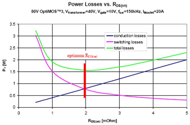 這個MOSFET選擇方法,是在假定應用具備最優(yōu)開關(guān)性能的條件下計算得到的。如果發(fā)生了諸如動態(tài)開啟或雪崩等二階效應,那么這個優(yōu)化表可能不準確。此外,硬開關(guān)轉(zhuǎn)換器拓撲可實現(xiàn)最佳結(jié)果。任何諧振軟開關(guān)拓撲均可能導致失配,因為可以回收利用開關(guān)過程產(chǎn)生的部分電量。在這種情況下,實際最優(yōu)RDS(on) 值將低于計算得到的值。請注意,一次側(cè)采用準諧振拓撲(例如相移ZVS全橋)也可使二次側(cè)的同步整流實現(xiàn)硬開關(guān)性能,從而也可以利用這種設(shè)計優(yōu)化表來進行優(yōu)化。