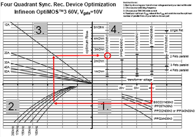 使用優(yōu)化表時,首先從次級變壓器電壓開始。在所用電壓值位置,畫一條垂直的直線。在兩條線相交處可以選出特定的MOSFET。通過一條水平的直線和一條垂直的直線,便可選擇開關(guān)頻率和MOSFET電流。如前面所討論,按最好從滿負載的20%至30%的電流值開始進行選擇。此時,可以在正Y軸上讀取最優(yōu)RDS(on)值。在第四個象限中,顯示了并聯(lián)MOSFET的最佳數(shù)量。在第四個象限中,必須選擇之前在第一個象限中選定的MOSFET型號。然后,按同樣的參數(shù)(變壓器電壓、開關(guān)頻率和電流RMS)對另一個型號的MOSFET重復執(zhí)行這個選擇過程。比較兩次選擇所得到的最優(yōu)RDS(on)值,最優(yōu)RDS(on)值越低的MOSFET所產(chǎn)生的功耗也越低,因而是更加高效的解決方案。
