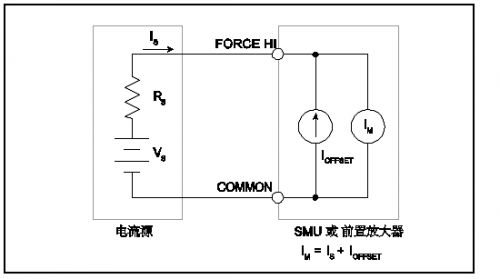 對于理想的安培計,當其輸入端子保持開路時,其讀數應為零。然而,現實中的安培計在輸入開路時確實存在小電流。這一電流被稱為輸入偏移電流,是由于有源器件的偏置電流以及流過儀器中絕緣體的漏泄電流產生的。SMU內產生的偏移電流已包括在吉時利4200-SCS型的技術指標中。如圖1所示,輸入偏移電流增加至被測電流,所以儀表測量的是兩個電流之和。