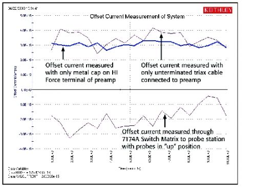 將系統配置為進行超低電流測量的前幾步之中有一步是確定整個測量系統的偏移和漏泄電流,包括4200-SCS本身、連接電纜、開關矩陣、測試夾具和探針。這可確定整個系統的噪底限值,并設置一個開始點,如果可能的話則進行改進。從測量源測量單元(SMU)的偏移開始,然后繼續增加測量電路組件,直到連接了除被測裝置(DUT)之外的全部組件。直接由帶有4200-PA遠程前置放大器的4200-SMU利用KITE軟件進行測量。