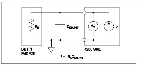 測量電路的建立時間在測量小電流和高電阻時尤其重要。建立時間是指施加或改變電流或電壓后測量達到穩定的時間。影響測量電路建立時間的因素包括并聯電容(CSHUNT)和源電阻(RS)。并聯電容是由于連接電纜、測試夾具、開關和探針造成的。DUT的源電阻越高,建立時間越長。圖6的測量電路中標出了并聯電容和源電阻。