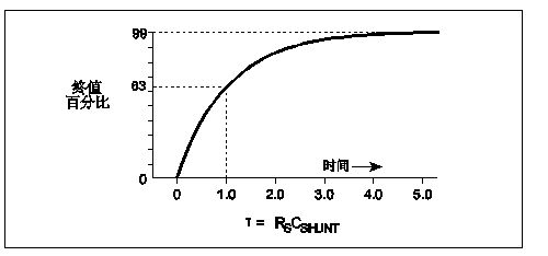 因此,讀數穩定至最終值的1%所需的建立時間為τ的5倍,也就是50秒。圖7所示為RC電路的階躍電壓指數響應。經過一個時間常數(τ = RC)后,電壓上升至最終值的63%。