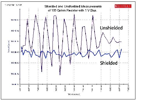 當帶電物體接近被測電路時,會發生靜電耦合或干擾。低阻抗時,由于電荷消失很快,所以干擾的影響不明顯。然而,高電阻材料不會使電荷快速衰減,則會造成測量不穩定、噪聲很大。通常情況下,當被測電流≤1nA或者被測電阻≥1GΩ時,靜電干擾就會成為問題。