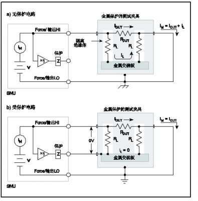 請勿混淆保護和屏蔽。屏蔽通常意味著采用金屬護欄防止靜電干擾影響高阻電路。保護則意味著使用增加的低阻導體,將其維持在于高阻電路相同的電勢,它將攔截任何干擾電壓或電流。保護不一定提供屏蔽。下圖為保護的兩個例子:1)利用保護降低測試夾具導致的漏流,而2)則利用保護降低由于電纜連接產生的漏流。