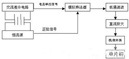為了解決上述各方法的缺陷,本文采用了四端子測量方式,將蓄電池兩端上的電壓響應信號通過交流差分電路與產(chǎn)生恒定交流源的正弦信號經(jīng)過模擬乘法器相乘,再將模擬乘法器的輸出電壓信號通過濾波電路,使交流信號轉(zhuǎn)變?yōu)橹绷餍盘枺绷餍盘柦?jīng)直流放大器放大后進行模數(shù)轉(zhuǎn)換,將轉(zhuǎn)換后的值送入單片機進行簡單處理。