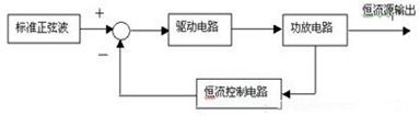 電路組成框圖如圖2所示:這是一個閉環(huán)控制系統(tǒng),電流負反饋電路。標準正弦波產(chǎn)生一個頻率穩(wěn)定、對稱、失真度低的1KHz正弦波信號。驅(qū)動電路把正弦波放大,去推動功放電路,得到正弦交流電流輸出。恒流控制電路從功放輸出中得到的信號,通過與給定的信號相比較,來調(diào)節(jié)驅(qū)動電路的信號,從而使輸出電流保持穩(wěn)定。