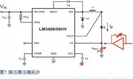 圖1顯示采用降壓拓?fù)涞囊粋€ LED驅(qū)動器。Vin必須始終高于LED 和RSNS上的電壓之和。電感電流為LED電流。該電流通過監(jiān)控CS引腳的電壓進行調(diào)節(jié)。當(dāng)CS開始低于設(shè)置的電壓時,流經(jīng) L1、LED和RSNS的電流脈沖的占空比增加,從而增加LED的平均電流。