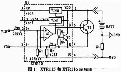 XTR115和XTR116用SO-8小型化封裝,其結構組成及原理圖如圖1所示,XTR115和XTR116內部電路主要由3部分組成。