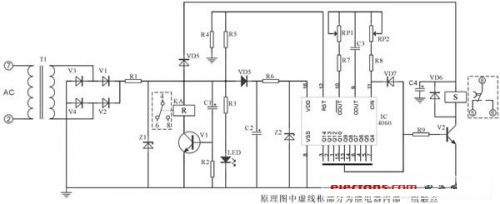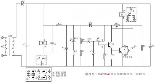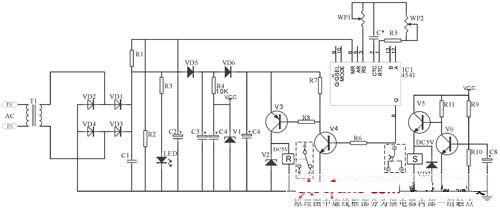 該電路核心部分由IC4541構(gòu)成,延時(shí)設(shè)定由RP2、C*設(shè)定,A-B端根據(jù)需求接相應(yīng)高、低電平(設(shè)定端)內(nèi)部2繞組閉鎖繼電器采用DC12V(因繼電器工作電壓與IC4060組成延時(shí)電器要低,則為保證其驅(qū)動(dòng)則分別由V6、V7、V1、V3構(gòu)成)。其中C2為二次儲(chǔ)能器件,可根據(jù)延時(shí)的長(zhǎng)短予以調(diào)整,C4為完成S置位線圈工作。