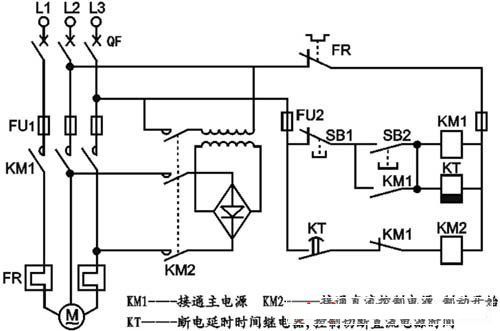 制動(dòng)過(guò)程:按下停止按鈕SB1→KM1斷電,KM1主觸點(diǎn)斷開(kāi),電機(jī)脫離電源,KM1輔助常閉觸點(diǎn)恢復(fù)閉合,KM2通電,接入直流電源,制動(dòng)開(kāi)始,同時(shí)KM1輔助常開(kāi)觸點(diǎn)又恢復(fù)斷開(kāi),則KT線圈呈斷電狀態(tài),延時(shí)開(kāi)始,待所設(shè)延時(shí)時(shí)間到達(dá)后,KT的延時(shí)斷開(kāi)常開(kāi)觸點(diǎn)恢復(fù)斷開(kāi),KM2失電,切斷直流電源,制動(dòng)結(jié)束。