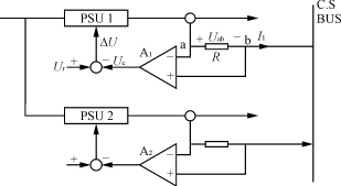如圖5所示,當(dāng)輸出達(dá)到均流時,輸出電流I1為零。反之,則電阻R上由于有電流I1流過,在其兩端產(chǎn)生一個電壓Uab,這個電壓經(jīng)過放大器A輸出電壓Uc,它與基準(zhǔn)電壓Ur比較后的ΔU,反饋回電源模塊的控制部分,從而調(diào)節(jié)輸出電流,最終實(shí)現(xiàn)均流。