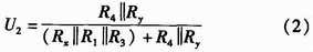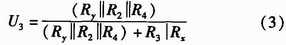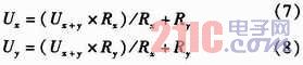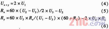 如圖2所示,U+和U-為被測線路的母線供電電壓,正常工作時兩母線間的電壓差Ux+y為440 V,且隨蓄電池內(nèi)阻變化。Rx,Ry分別為被測線路的正母線絕緣電阻和負(fù)母線絕緣電阻。正、負(fù)母線絕緣電阻反映的是64路的正、負(fù)支路的總體絕緣性能,等效于各個支路的正、負(fù)絕緣電阻的并聯(lián),正常時兩母線絕緣電阻>20 kΩ。Ux和Uy為正負(fù)母線對地電壓,大小隨正負(fù)母線的絕緣電阻變化,但兩母線電壓差恒定為Ux+y。為了檢測正負(fù)母線電壓Ux,Uy,Rx,Ry,系統(tǒng)采用了“平衡-不平衡檢測法”檢測母線電壓和母線絕緣電阻。計算公式如式(1)所示。