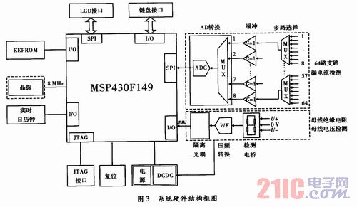 直流接地檢測系統(tǒng)采用低功耗處理器MSP430F149為硬件核心,外圍電路可分為數(shù)據(jù)采集模塊、人機交互模塊、處理器模塊。數(shù)據(jù)采集模塊負(fù)責(zé)檢測64路支路的漏電流、母線電壓、母線絕緣電阻;人機交互模塊負(fù)責(zé)進(jìn)行液晶顯示和鍵盤輸入;處理器模塊負(fù)責(zé)協(xié)調(diào)整個系統(tǒng)的數(shù)據(jù)處理,數(shù)據(jù)存儲,人機交互等。具體的硬件結(jié)構(gòu)框圖,如圖3所示。