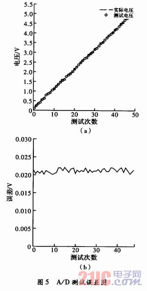 為了達(dá)到好的測試效果,A/D采集必須達(dá)到一定的測試精度,圖5是A/D采集的實測數(shù)據(jù)和測試誤差分析曲線,從圖中可以看出,A/D采集的誤差約20 mV,屬于正常范圍,因為系統(tǒng)采用8位A/D,5 V基準(zhǔn)電壓。這個采樣精度滿足整體的設(shè)計要求。