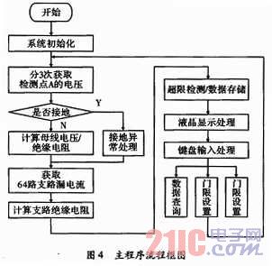 整個程序的編寫均由C語言完成,在程序設(shè)計中,采用了結(jié)構(gòu)化程序設(shè)計方法,使各個模塊程序相對獨立,便于程序代碼的維護(hù)、移植和升級。同時,這樣分離式的程序設(shè)計,降低了代碼的調(diào)試難度,縮短了調(diào)試周期。將與接地故障信息(如母線電壓,母線絕緣電阻,支路絕緣電阻,接地支路號等)密切相關(guān)的數(shù)據(jù)放在一個結(jié)構(gòu)體里,便于掉電存儲與回放顯示。系統(tǒng)的主程序流程圖,如圖4所示。
