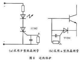 采用溫度繼電器來檢測電源裝置內(nèi)部的溫度,當(dāng)電源裝置內(nèi)部產(chǎn)生過熱時(shí),溫度繼電器就動(dòng)作,使整機(jī)告警電路處于告警狀態(tài),實(shí)現(xiàn)對(duì)電源的過熱保護(hù)。亦可將溫度繼電器置于開關(guān)三極管的附近,一般大功率管允許的最高管殼溫度是75℃,調(diào)節(jié)溫度整定值為60℃。當(dāng)管殼溫度超過允許值后繼電器就切斷電器,對(duì)開關(guān)管進(jìn)行保護(hù)。半導(dǎo)體熱敏開關(guān)器件“熱晶閘管”在超溫保護(hù)方面有重要作用。它可以用作溫度指示電路。根據(jù)p型控制柵熱晶閘管(TT102)的特性,由RT值確定該器件的導(dǎo)通溫度,RT越大,導(dǎo)通溫度越低。當(dāng)將其放置功率開關(guān)三極管附近,或在電源裝置內(nèi)時(shí),它就能起到溫度指示作用。當(dāng)功率管的管殼溫度或者裝置內(nèi)部的溫度超過允許值時(shí),熱晶閘管就導(dǎo)通,使發(fā)光二極管發(fā)亮告警。倘若配合光電耦合器,就可使整機(jī)告警電路動(dòng)作,保護(hù)開關(guān)穩(wěn)壓器。它亦可以象圖8(b)那樣用作功率晶體管的過熱保護(hù),晶體開關(guān)管的基極電流被n控制柵型熱晶閘管TT201旁路,開關(guān)管截止,切斷集電極電流,防止過熱。