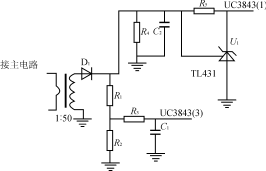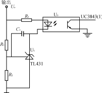 電壓反饋電路如圖3所示,輸出電壓通過集成穩(wěn)壓器TL431和光耦反饋到UC3843(1)腳,調(diào)節(jié)R1、R2分壓比可設(shè)定和調(diào)節(jié)輸出電壓,達(dá)到較高的穩(wěn)壓精度。如果輸出電壓Uo升高,集成穩(wěn)壓器TL431陰極到陽極的電流增大,使光耦輸出三極管電流增大即UC3843(1)腳對地的分流變大,UC3843輸出脈寬相應(yīng)變窄,輸出電壓Uo減小。同樣地,如果輸出電壓Uo減小,可通過反饋調(diào)節(jié)使之升高。