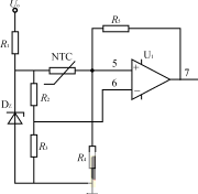 圖4為變壓器過熱保護(hù)電路,R3=R4,NTC為粘貼在變壓器上的負(fù)溫度系數(shù)的熱敏電阻,常溫下RNTCR2,運放U1構(gòu)成滯環(huán)比較器。正常工作時,NTC阻值較大,運放U+<U-,輸出為零;當(dāng)溫度上升到設(shè)定值時,運放U1輸出為高電平,送到PWM控制芯片使輸出脈沖關(guān)斷。