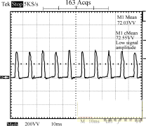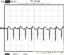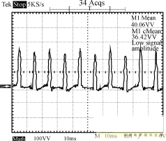 圖8~圖10為輸入電壓220V的條件下,輸出端的負(fù)載狀況分別為空載、半載和全載時,輸入端的功率波形圖。由這3個圖可以看出,輸入功率是個脈沖序列,周期為10ms,即每半個工頻周期電源輸入端通過整流橋為輸入平滑濾波電容充一次電。測量輸入功率時串聯(lián)于輸入端的采樣電阻為2.0Ω,因此功率為圖示值除以2。半載時輸出功率為:12.3662/10=15.29W,全載時輸出功率為:12.2552/5=30.04W。電路正常工作時,漏極電壓波形如圖11所示。