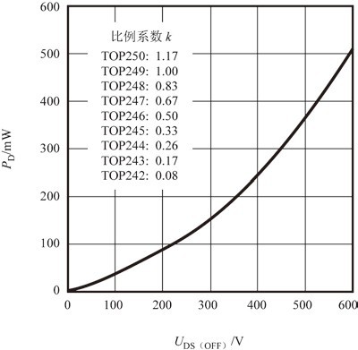 (5)在相同的輸出功率下I DS(ON)可視為恒定值,而芯片的功耗隨所選TOPSwitch-GX型號的增大而減小,隨型號的減小而增大。因此選擇較大的型號TOP250Y,其功耗要比TOP249Y更低。