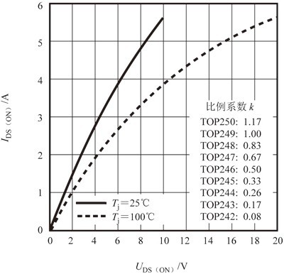 下面對開關(guān)電源散熱器的設(shè)計要點作進一步分析。以TOPSwitch-GX(TOP242~TOP250)系列單片開關(guān)電源為例,當MOSFET導(dǎo)通時漏-源極導(dǎo)通電流(I DS(ON) )與漏-源極導(dǎo)通電壓(U DS(ON) )的歸一化曲線如圖2所示。