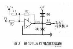 ADMC331內(nèi)的A/D轉(zhuǎn)換器由7個模擬輸入通道和比較器等電路組成,數(shù)據(jù)轉(zhuǎn)換是通過判斷模擬輸入量與片內(nèi)高穩(wěn)定度鋸齒波的交點來實現(xiàn)的。考慮到A/D 轉(zhuǎn)換器能接受的電平范圍為0~+5V,因此必須將電壓互感器檢測的電壓和電流傳感器檢測的電流(轉(zhuǎn)換為電壓量)按照一定比例轉(zhuǎn)換到這個范圍內(nèi)。輸出電壓和電流檢測接口電路分別如圖4和圖5所示,這部分電路的輸入阻抗應(yīng)比較大,以盡量減少對設(shè)備信號的影響,并且輸出阻抗應(yīng)同A/D轉(zhuǎn)換器的輸入阻抗相匹配。
