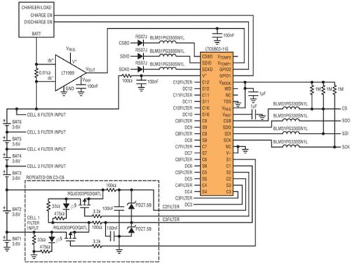 一個(gè)簡(jiǎn)單的電池監(jiān)視器和平衡系統(tǒng)如圖 1 所示。該電池監(jiān)視系統(tǒng)的硬件是圍繞高度集成的 LTC6803-1 多節(jié)電池監(jiān)視 IC 設(shè)計(jì)的。每個(gè) LTC6803-1 能測(cè)量多達(dá) 12 節(jié)電池,并允許以可連接多個(gè) IC 的串行菊花鏈形式連接,從而使一個(gè)系統(tǒng)能通過(guò)一個(gè)串行端口監(jiān)視超過(guò) 100 個(gè)電池。當(dāng)設(shè)計(jì)一個(gè)電池監(jiān)視系統(tǒng)時(shí),某些規(guī)范應(yīng)當(dāng)給以特殊考慮,首先是電池電壓準(zhǔn)確度。當(dāng)試圖決定單個(gè)電池的充電狀態(tài)時(shí),電池電壓的準(zhǔn)確度至關(guān)重要,而且一節(jié)電池能否在接近工作極限的條件下工作,電池電壓的準(zhǔn)確度是限制因素之一。LTC6803 具 1.5mV 的分辨率,準(zhǔn)確度為 4.3mV。這將允許該控制器就電池狀態(tài)做出準(zhǔn)確決策,而不論使用的是什么樣的電池化學(xué)組成。其次,電池組不平衡的一個(gè)主要來(lái)源是,電池監(jiān)視電路本身的電源和備用電流的差異。在汽車(chē)應(yīng)用中,備用電流尤其重要,因?yàn)榇蠖鄶?shù)汽車(chē)在大部分時(shí)間里都是熄火的,這時(shí)電池監(jiān)視系統(tǒng)處于備用模式。LTC6803 僅具 12uA 備用電流,電流范圍規(guī)定為 6uA 至 18uA,從而可保證在一個(gè)大型電池組中,最嚴(yán)重的不平衡為 12uA,這使每月不平衡低于 10mAhr。有兩個(gè) ADC 輸入可用來(lái)監(jiān)視電池溫度或其他的傳感器數(shù)據(jù)。圖 1 中顯示的設(shè)計(jì)用 Vtemp1 輸入測(cè)量電池電流。電流用 LT1999 測(cè)量。LT1999 是一款高壓雙向電流檢測(cè)放大器,具 -5V 至 80V 的輸入范圍,而且在本文所述測(cè)試情況下,設(shè)置為監(jiān)視電池組高壓端的 ±10A。LTC6803 上的兩個(gè) GPIO 引腳用來(lái)控制一個(gè)有源負(fù)載和一個(gè)充電器。當(dāng)充電結(jié)束或達(dá)到放電點(diǎn)時(shí),這允許 LTC6803 斷開(kāi)電池與充電器或負(fù)載的連接。