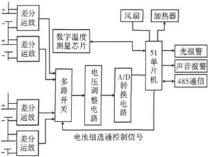 具有高電壓、高容量、循環(huán)壽命長(zhǎng)、安全性能好等優(yōu)點(diǎn)的鋰離子電池,在便攜式電子設(shè)備、電動(dòng)汽車(chē)、空間技術(shù)、國(guó)防工業(yè)等多方面具有廣闊的應(yīng)用前景。由若干節(jié)鋰離子電池經(jīng)串聯(lián)組成的動(dòng)力鋰離子電池組目前應(yīng)用最為廣泛。由于每節(jié)單體電池的電壓不一致,使用中電池不允許過(guò)充電、過(guò)放電,電池的性能和壽命受溫度影響較大等特點(diǎn),必須對(duì)串聯(lián)鋰離子電池組進(jìn)行監(jiān)測(cè),確保在使用中鋰離子電池具有良好的狀態(tài),或者使用中電池出現(xiàn)問(wèn)題立即報(bào)警,電源管理系統(tǒng)立即采取保障措施,并提醒相關(guān)人員檢修。單體電壓和電池組的溫度是辨別串聯(lián)鋰離子電池組是否正常工作的主要技術(shù)指標(biāo)。文獻(xiàn)[1]采用直接采樣法,將要測(cè)量的單體電池電壓存儲(chǔ)在非電容上進(jìn)行測(cè)量。該方法反應(yīng)時(shí)間慢、誤差較大、控制復(fù)雜;文獻(xiàn)[2]采用運(yùn)放和光藕繼電器來(lái)測(cè)量串聯(lián)電池組的單體電壓。該方法對(duì)光耦的線性度要求很高,導(dǎo)致硬件成本較高。目前,直接采用集成芯片的串聯(lián)鋰離子電池組監(jiān)控系統(tǒng)受到青睞,但該方法串聯(lián)電池的數(shù)目固定,導(dǎo)致應(yīng)用不靈活、硬件成本高等缺點(diǎn)。文中研制了一種動(dòng)力鋰離子電池組監(jiān)測(cè)系統(tǒng),對(duì)串聯(lián)鋰離子電池組的單體電壓和電池組的溫度進(jìn)行在線監(jiān)測(cè),當(dāng)單體電池電壓偏離規(guī)定區(qū)間時(shí),監(jiān)測(cè)系統(tǒng)啟動(dòng)報(bào)警程序進(jìn)行聲、光報(bào)警;當(dāng)電池組溫度偏離規(guī)定的區(qū)間時(shí),監(jiān)測(cè)系統(tǒng)啟動(dòng)風(fēng)扇或加熱控制電路,并存儲(chǔ)有關(guān)數(shù)據(jù),確保電池組正常工作。整個(gè)監(jiān)測(cè)系統(tǒng)具有連續(xù)測(cè)量分量、簡(jiǎn)單經(jīng)濟(jì)、精度高和可靠性高的特點(diǎn)。