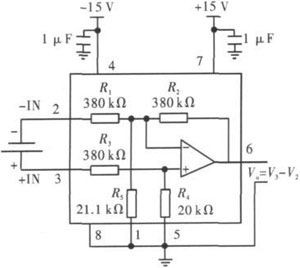 INA117內(nèi)置了380kΩ、20kΩ和21.1kΩ 3個(gè)電阻,因此外部電路省去精密電阻,減少了精密電阻帶來(lái)的誤差和系統(tǒng)復(fù)雜程度。圖2是INA117輸出1節(jié)電池電壓的接法,6腳和1腳之間的電壓就是1節(jié)電池兩端的電壓差。