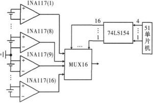 每節(jié)鋰離子電池最高電壓為5V,由圖3可得,第1個(gè)INA117的3腳的輸入電勢(shì)最高為40V。同理,第16個(gè)INA117的2腳輸入電勢(shì)最低為-40V。第1至8個(gè)INA117的輸出電壓為正,第9至16個(gè)INA117的輸出電壓為負(fù),所以多選一模擬開(kāi)關(guān)和A/D轉(zhuǎn)換器都要求可以輸入正、負(fù)電壓。多選一模擬開(kāi)關(guān)選用MUX16,為16選1可正負(fù)電壓輸入模擬開(kāi)關(guān),因此16節(jié)電池只需1個(gè)MUX16.但由于單片機(jī)IO口有限,文中用一片74LS154擴(kuò)展了IO口,僅用單片機(jī)的4個(gè)IO口即可控制MUX16分別選通單節(jié)鋰離子電池進(jìn)行電壓采樣。