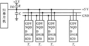 針對(duì)串聯(lián)電池組,傳統(tǒng)的測(cè)溫方法多采用模擬溫度傳感器進(jìn)行測(cè)量,在數(shù)據(jù)的采集和傳輸過(guò)程中易受外界環(huán)境的干擾,從而使測(cè)得的結(jié)果誤差較大,且當(dāng)測(cè)量點(diǎn)較多時(shí),連線較復(fù)雜。文中采用單片機(jī)和單總線數(shù)字式溫度傳感器DS18B20來(lái)解決上述問(wèn)題[5]。其原理如圖5所示。