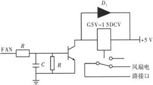 電路如圖6所示,F(xiàn)AN為低電平時(shí),晶體管9014不導(dǎo)通,此時(shí)繼電器無(wú)動(dòng)作;當(dāng)FAN為高電平時(shí),晶體管9014導(dǎo)通,使得繼電器觸點(diǎn)吸合,風(fēng)扇在24V電源電壓的供電下開(kāi)始工作。