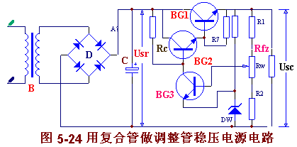 在穩壓電源中,負載電流Ifz 要流過調整管,輸出大電流的電源必須使用大功率的調整管,這就要求有足夠大的電流供給調整管的基極,而比較放大電路供不出所需要的大電流,另一方面,調整管需要有較高的電流放大倍數,才能有效地提高穩壓性能,但是大功率管一般電流放大倍數都不高。解決這些矛盾的辦法,是給原有的調整管再配上一個或幾個“助手”,組成復合管。用復合管做調整管的穩壓電源電路如圖5一24所示。