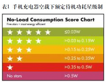 這些關(guān)注的結(jié)果是采取一系列措施來提升效率和降低空載功耗的需求。其中最新最嚴(yán)格的是由全球前五大手機廠商提出的一項自愿性的充電器星級制協(xié)定,用以標(biāo)志在充電完成之后,充電器仍插在壁式插座上時的耗能量。該星級制從0星級開始,最高5星級。空載下額定待機功耗大于0.5W的充電器為0星級標(biāo)簽,待機功耗小于0.03W(30mW)的為5星級(見表1)。通過比較,大多數(shù)現(xiàn)有手機的待機功耗在150~300mW范圍。