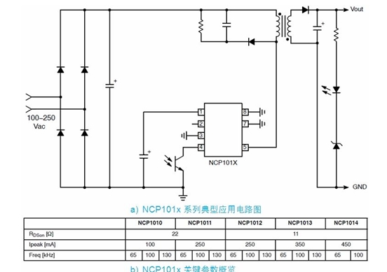 以 NCP101x 為例,這系列器件集成了固定頻率電流模式控制器及典型導通阻抗為 11 或 22 ? 的 700 V MOSFET,提供構建強固及低成本開關電源所需的全部特性,包括軟啟動、頻率抖動、短路保護、跳周期、最大峰值電流設定點及動態自供電(不需要輔助繞 組)等。在正常負載工作期間,NCP101x 以 65、100 及 130 kHz 中的某一頻率開關;而當電流設定點降到低于某個給定值(如輸出功率需求消失)時,NCP101x 自動進入所謂的跳周期模式(在此模式下跳除不需要的開關周期),從而提供極佳的輕載能效。由于進入跳周期模式通常發生在最大峰值電流的 1/4 時,故沒有可聽噪聲產生。因此,待機能耗降至最低,且沒有可聽噪聲產生。NCP101x 典型應用電路及不同型號的關鍵參數參見圖 2。