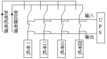 本系統設計利用美國山特公司3C3 UPS的特性,該UPS有一個內部電子旁路檢修開關,UPS在關機狀態下,電源是通過UPS內部電子旁路直接輸出供電。外部再加一個旁路開關(圖1),外部旁路開關與內部電子旁路開關形成并聯。UPS加入供電系統時, UPS必須在關機狀態下,接通UPS輸入輸出端開關,UPS與外部旁路開關形成并聯接通,然后斷開外部旁路開關,再將UPS開機。UPS退出供電系統時,必須先將UPS關機,接通外部旁路開關(若UPS未在關機狀態下,相當于UPS在開機時輸出端加入反向電壓,UPS可能燒毀),斷開UPS輸入輸出端開關, UPS退出供電系統。這樣就很容易做到將UPS加入和退出供電系統中。