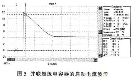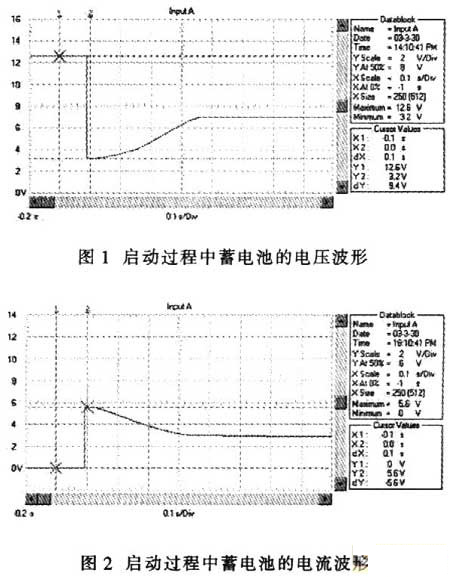超級電容器與蓄電池并聯時,汽車啟動過程的電壓波形如圖4所示,電流波形如圖5所示。與圖1和圖2相比,啟動瞬間電壓跌落由只采用蓄電池時的3.2V提升到7.2V;啟動電流從560A提高到l200A;啟動瞬時的電源輸出功率從2kW上升到8.7kW;啟動過程的平穩電壓由7V提高到9.4V;啟動過程的平穩電流由280A提高到440A;啟動過程的電源平穩輸出功率從2.44kW提高到4.12kW。
