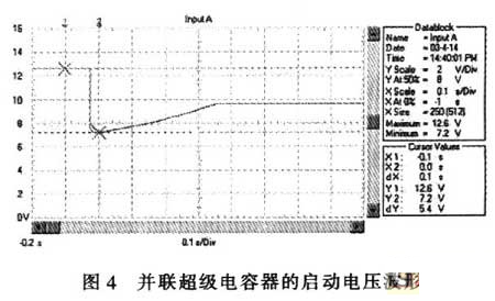 超級電容器與蓄電池并聯時,由于超級電容器的等效串聯電阻(ESR)遠低于蓄電池的內阻,因此,在啟動瞬間,1200A啟動電流中的800A電流由超級電容器提供,蓄電池僅提供400A的電流,明顯低于僅采用蓄電池的560A,有效降低了蓄電池極板的極化,阻止了蓄電池內阻的上升,使啟動過程的平穩電壓得到提高。最為重要的是蓄電池極板極化的減輕不僅有利于延長蓄電池的使用壽命,而且也可以消除頻繁啟動對蓄電池壽命的影響。