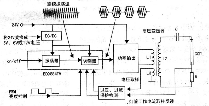 加電后,當背光燈驅動板收到CPU送來的“ON”信號(常見為高電平啟動,多為3V~5V)后,控制振蕩器開始工作,產生頻率為30kHz~lOOkHz的振蕩信號送入調制器內部,對CPU送來的PWM亮度調節信號進行調制,調制后輸出斷續的30kHz~lOOkHz激勵信號驅動功率輸出電路,經高壓變壓器升壓后輸出高壓并點亮背光燈管。
