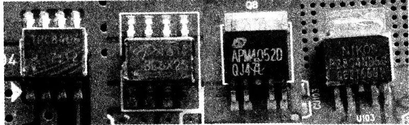 背光燈驅動板主要由振蕩器、調制器、功率輸出電路及保護檢測電路組成,如1圖所示。在實際電路中,除功率輸出部分和檢測保護部分外,振蕩器、調制器及控制部分通常由一塊單片集成電路完成,這類集成電路常用的主要有BD(Rohm公司生產,如BD9884FV、BD9766等)及OZ系列(凹凸微電子公司生產,如02960、02964等);功率輸出管多采用互補的功率型場效應管,有的采用3腳和8腳(①~③腳為S極,④腳為G極,⑤-⑧腳為D極)貼片封裝型,常見型號有D454、RSS085、D413、TPC8110、FDD6635.FDD6637等,如圖2所示;還有的采用由N溝道和P溝道組合的5腳或8腳MOSFET功率塊(①腳為Sl極,②腳為Gl極,③腳為S2極,④腳為G2極,⑤~⑧腳為D1、D2極),如SP8M3、TPC8406、4614、APM40520、P2804ND5G等,如圖3所示。保護檢測多由集成電路10393、358、393或LM324及其外圍元件來完成。輸出電路主要由高壓變壓器、諧振電容及背光燈管組成,并設有輸出電壓、輸出電流取樣電路。
