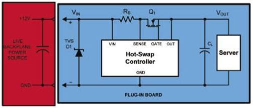 在熱插拔應用中,TVS主要用作需要被中斷的差模電流的接地分流路徑。熱插拔系統常被用在分布式電源系統中提供可靠的系統保護和電氣管理,典型服務器系統的線卡接口和熱插拔電路原理圖如圖5所示。
