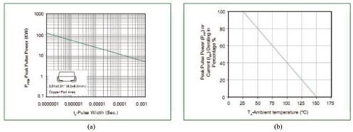 對瞬變電壓的吸收功率(峰值)與瞬變電壓脈沖寬度間的關系。手冊給的只是特定脈寬下的吸收功率(峰值),而實際線路中的脈沖寬度則變化莫測,事前要有估計。對寬脈沖應降額使用。