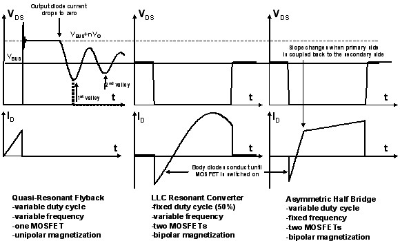 圖1所示為采用三種不同拓撲 (準諧振反激式拓撲、LLC諧振拓撲和使用軟開關技術的非對稱半橋拓撲) 的開關的電壓和電流波形。