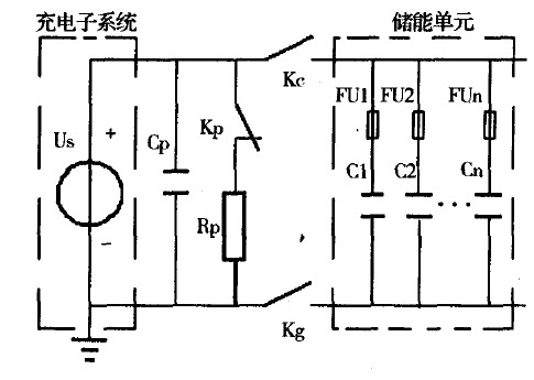 通常,充電子系統(tǒng)內(nèi)部配有過電流、過電壓和過熱等故障保護或異常告警裝置。但這些裝置的保護范圍一般僅限于充電子系統(tǒng)內(nèi)部,PPS放電時浪涌電壓等外部因素仍可能造成充電設備損壞。因此,在儲能單元和充電子系統(tǒng)間還需配置一些隔離和保護電路。圖1給出了用于ETCG研究的PPS所配置的充電隔離及保護電路。圖1中,充電隔離開關(guān)(Kc)和地絕緣隔離開關(guān)(Kg)在充電結(jié)束后打開,用以防止PPS放電時由負載等因素產(chǎn)生的浪涌高電壓通過充電子系統(tǒng)對地放電,可以避免因此所造成的充電設備絕緣損壞;充電輸出終端并聯(lián)了一小容量電容器(Cp)及其安全釋能電路(開關(guān)Kp、電阻Rp),目的在于防止空載誤充電,以避免在此情況下充電電路末端電壓急劇升高損壞充電設備。