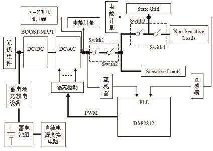 正常工作時,開關Switch1、Switch2、Switch3、Switch4同時閉合,為當地負荷提供電能;當出現電網缺相、電壓嚴重跌落等非正常狀況時,由DSP檢測出異常情況,做出判斷決策,并控制開關的開通與0關斷。這時,開通Switch1和Switch2,關斷Switch3,保證重要負荷的供電。當逆變器發生故障時,立即斷開Switch1,逆變器退出,同時斷開Switch4,由電網對重要負荷供電。當逆變器故障消失時,在與電網同步后,開通Switch1,再閉合Switch4,恢復對當地負荷的供電。當需要檢修逆變器時,先斷開開關Switch2,檢修完成后,重新閉合Switch2。