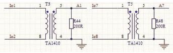 此系統輸出電流小于1A,故選擇最大可以測量1A的電壓型電流互感器TA1410,負載電阻用是200歐,輸出電壓為-1V~1V的交流電壓。電路如圖4所示。