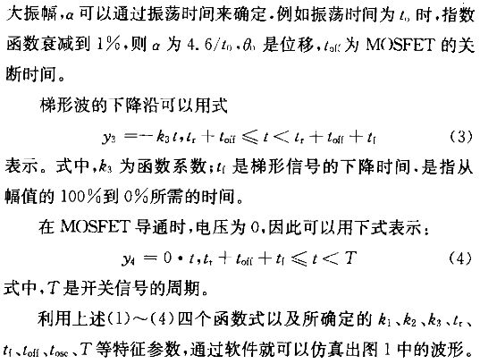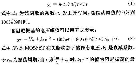 圖1中展示了一MOSFET的漏源極電壓波形,為了研究其上升時間、下降時間、阻尼振蕩等對其頻譜的影響,需要確定該波形的特征參數,然后運用Matlab編程仿真。由于該波形是由一個梯形信號和一個阻尼振蕩信號疊加而成,因此可以用分段函數進行模擬。上升沿可以用式(1)表示。